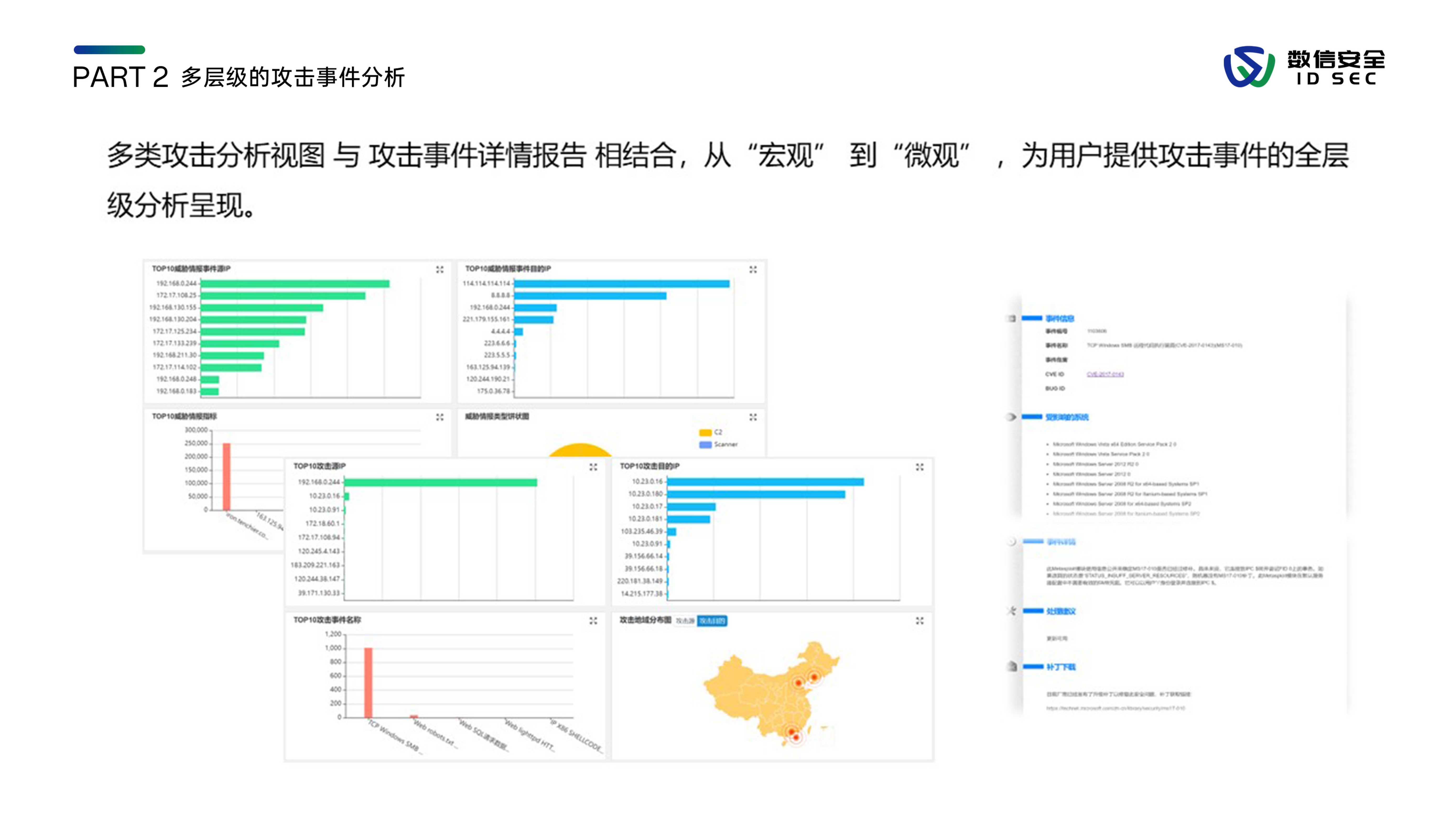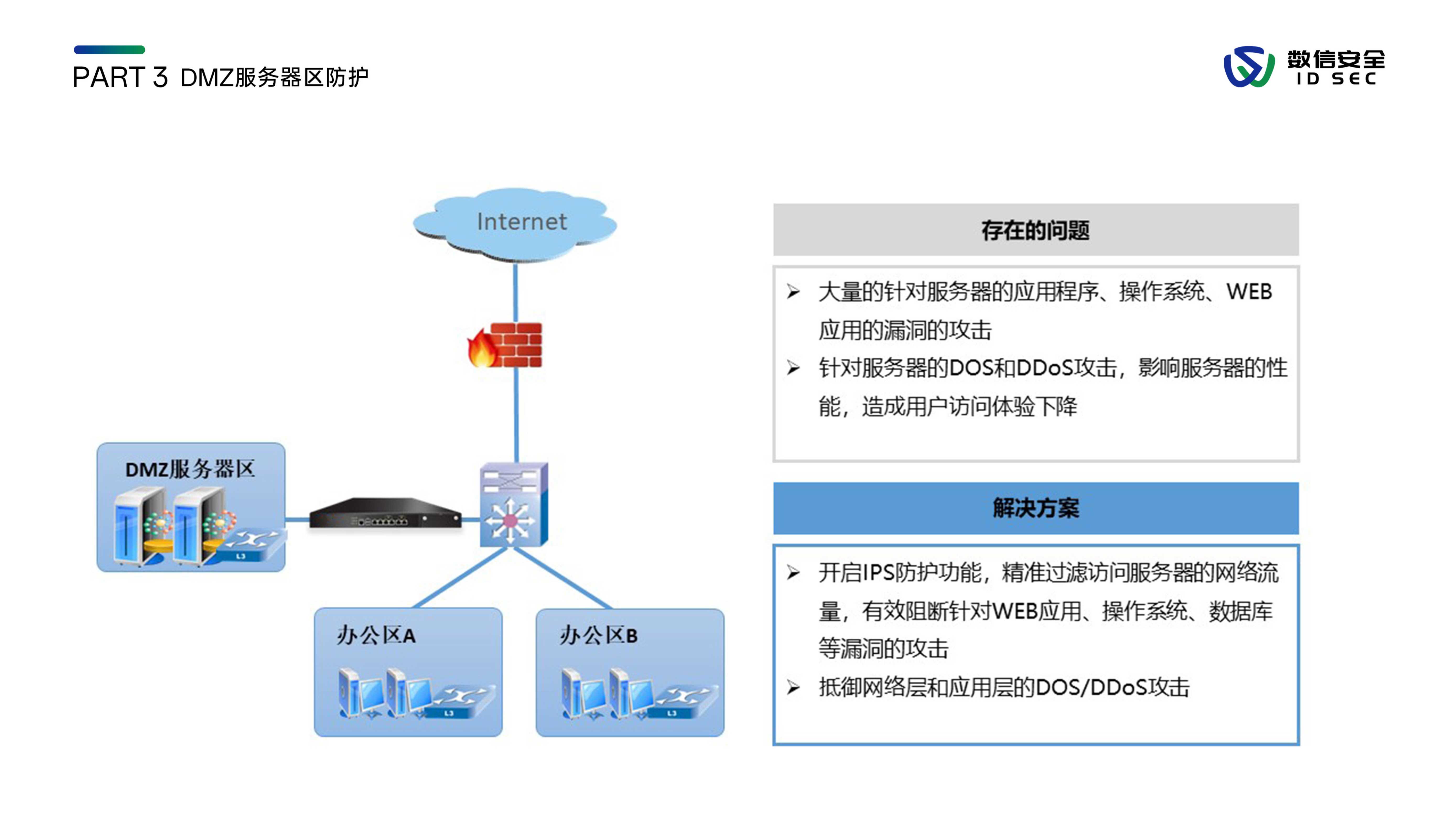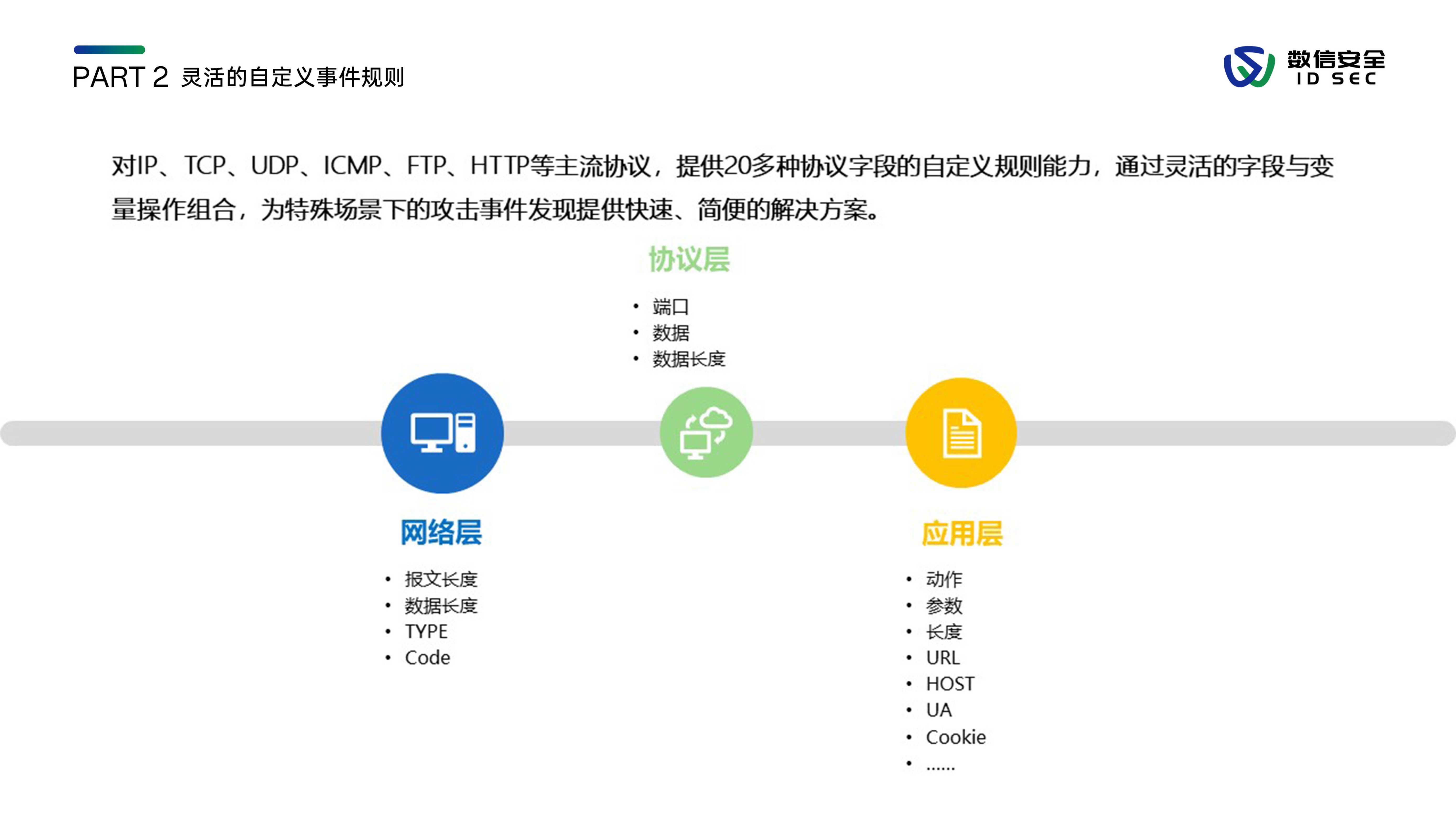 数信安入侵防御系统,是数信安自主研发的新一代入侵防御类安全产品,用来应对新的网络环境中,威胁手段越来越隐蔽、威胁范围覆盖云到端、威胁来源不分内外的新挑战。产品站在全新的用户视角,全面深入到2-7层进行分析和检测,利用流重组及协议状态分析等技术手段,对缓冲区溢出、SQL注入、暴力猜测、DoS攻击、扫描探测、蠕虫病毒、木马后门等各类黑客攻击和恶意流量进行实时阻断及报警,内置特征库数量3000+,检测库11000+,全面兼容CVE/CNCVE,并通过与防火墙联动、发送邮件、SNMP trap等方式进行威胁协同防御或报警。
